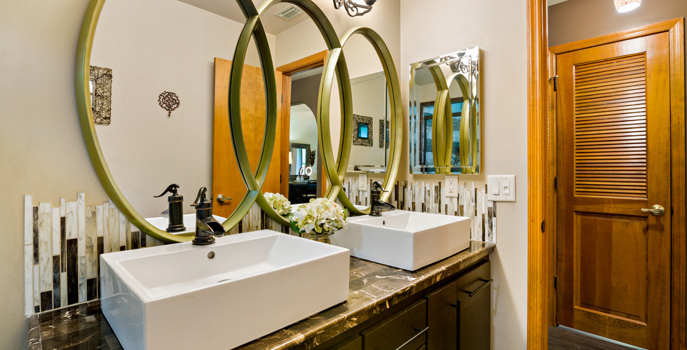 1. I have a sink addiction. I think that is an area where you can add real pop to your space and you don't have to break the bank to do it. It's also really overlooked when designing a bathroom. Overstock.com is an excellent resource for finding sinks that are interesting and also affordable. The rectangular sinks in the bathroom above I purchased for under $150 each.